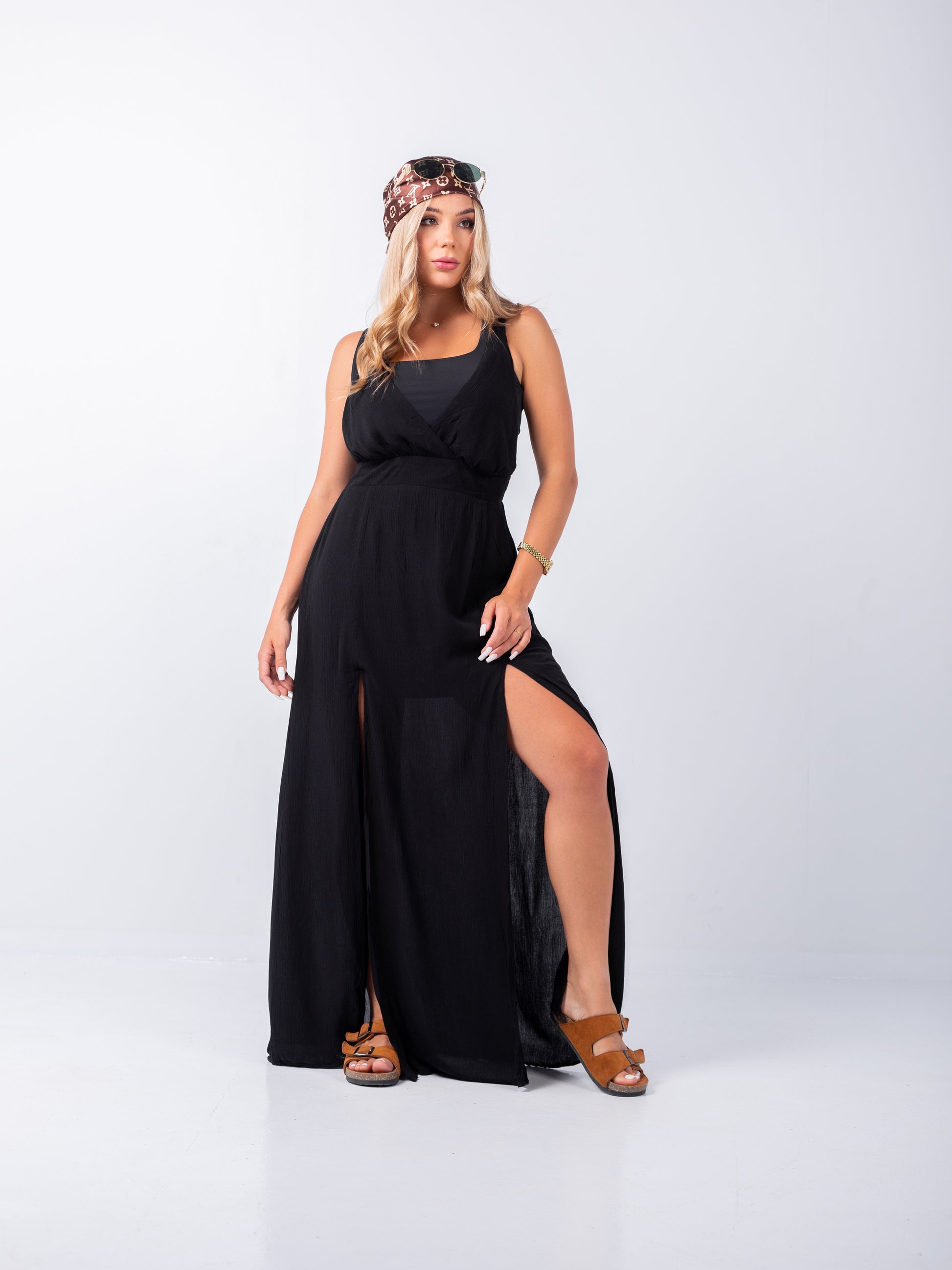Designed with a soft V-neck wrap-style bodice and double high side slits, it brings a fresh and breezy feel to your wardrobe. Perfect for summer outings, beach days, or casual occasions, this dress offers comfort and style in one graceful look.