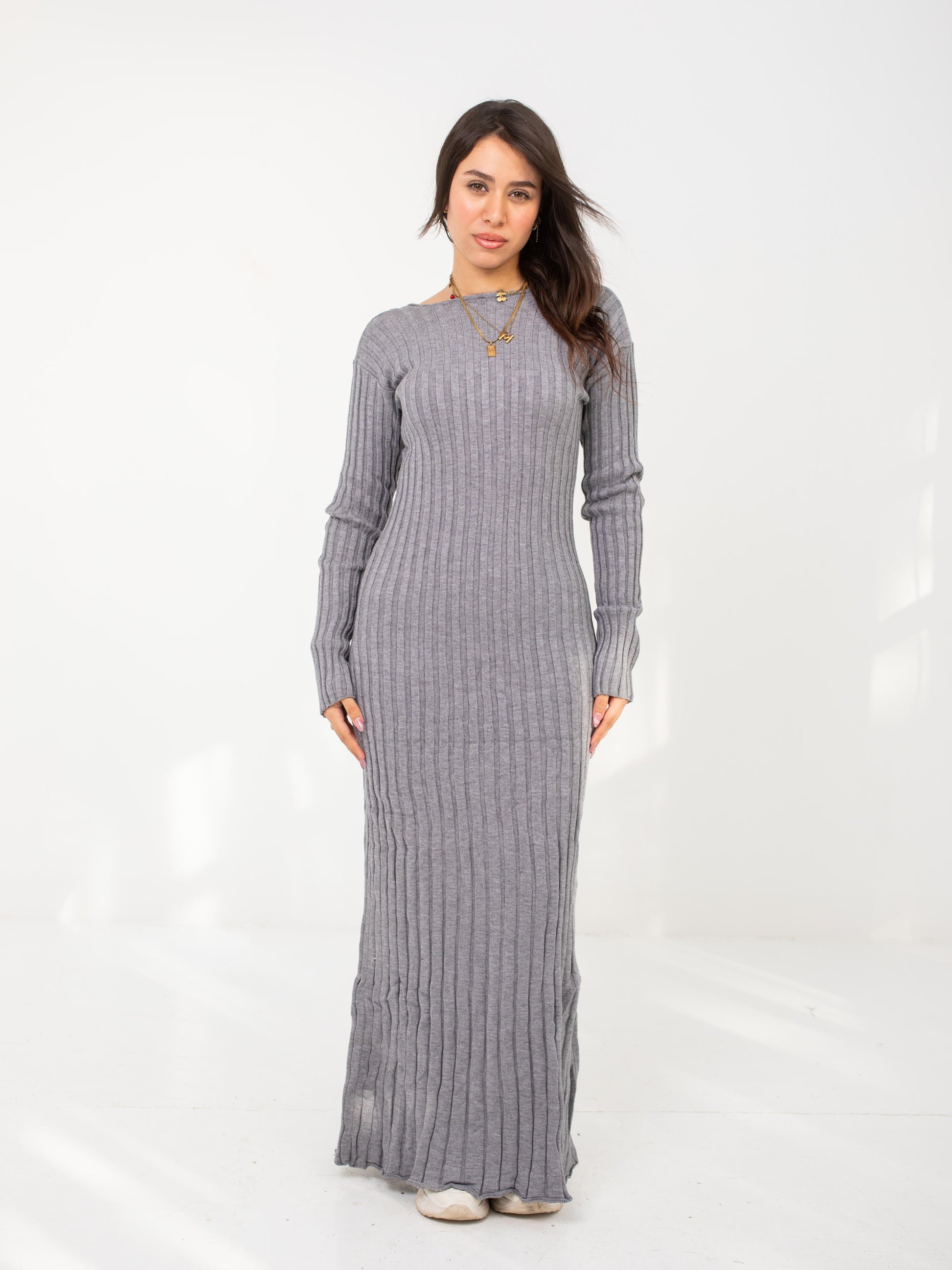 levate your everyday style with a dress that adapts to you. Crafted from a comfortable rib knit, this long maxi dress offers a minimalist silhouette. Its innovative design allows you to wear either the crewneck or the V-neck in the front, giving you two distinct looks from one effortlessly chic piece.
