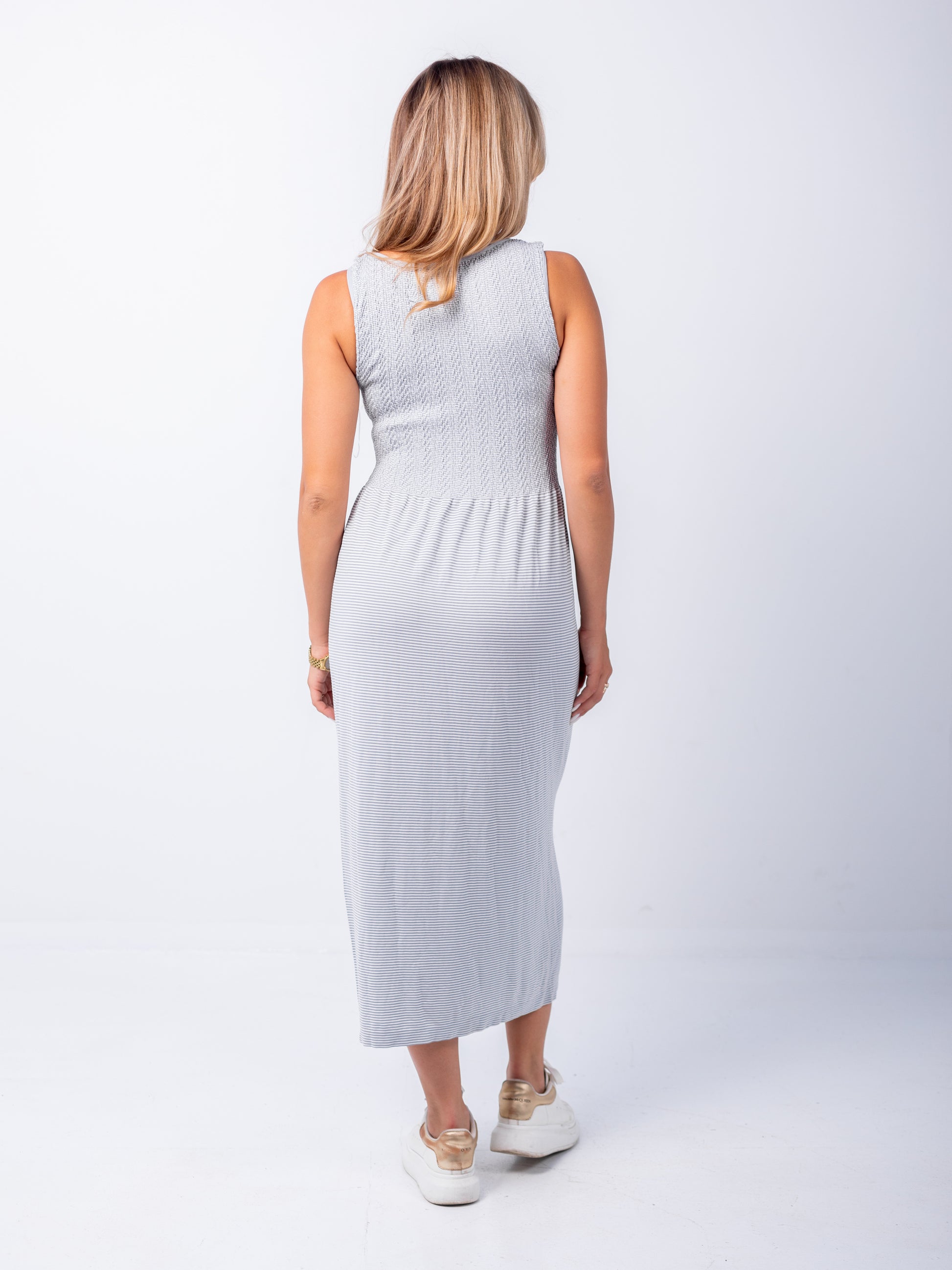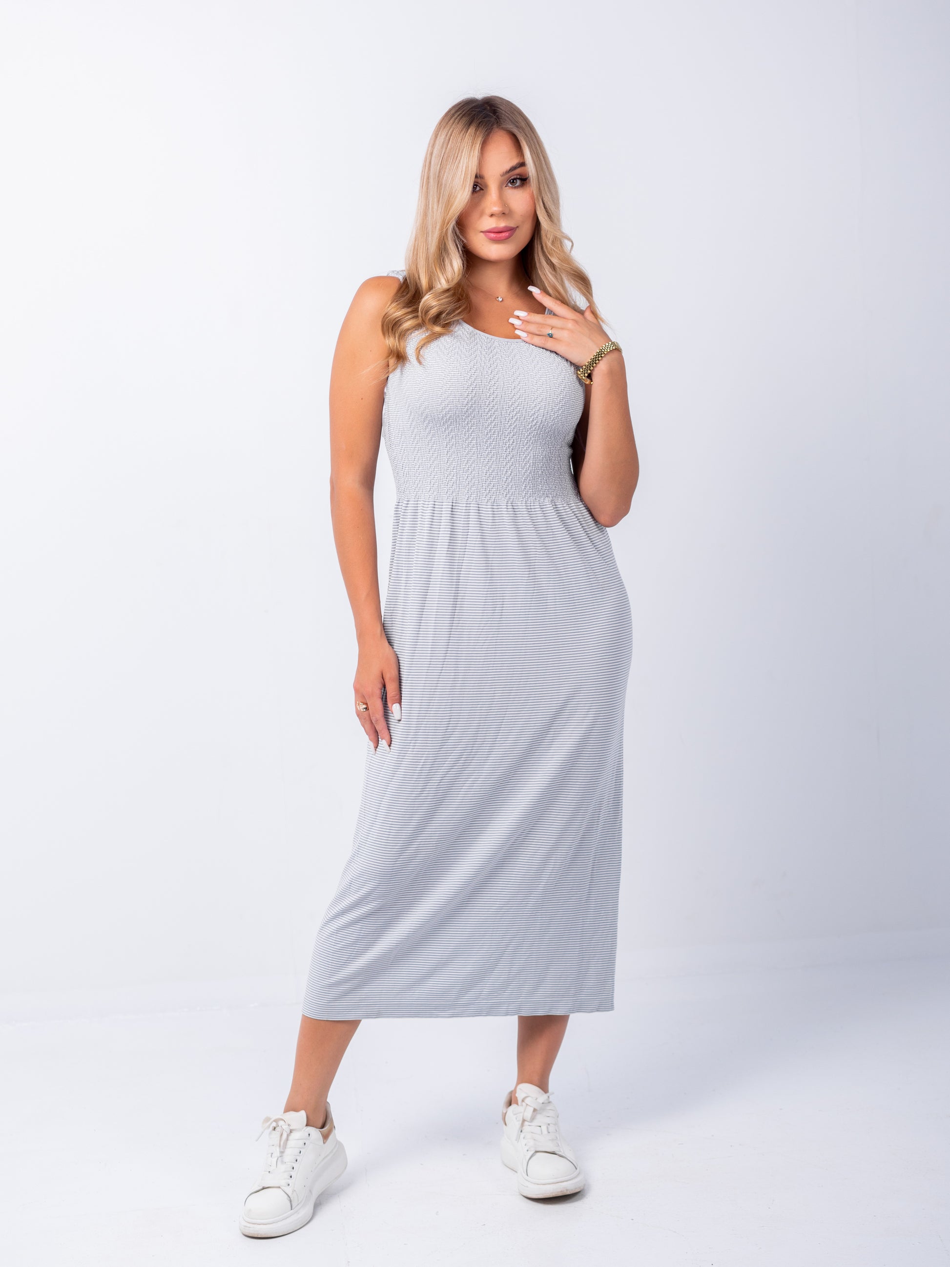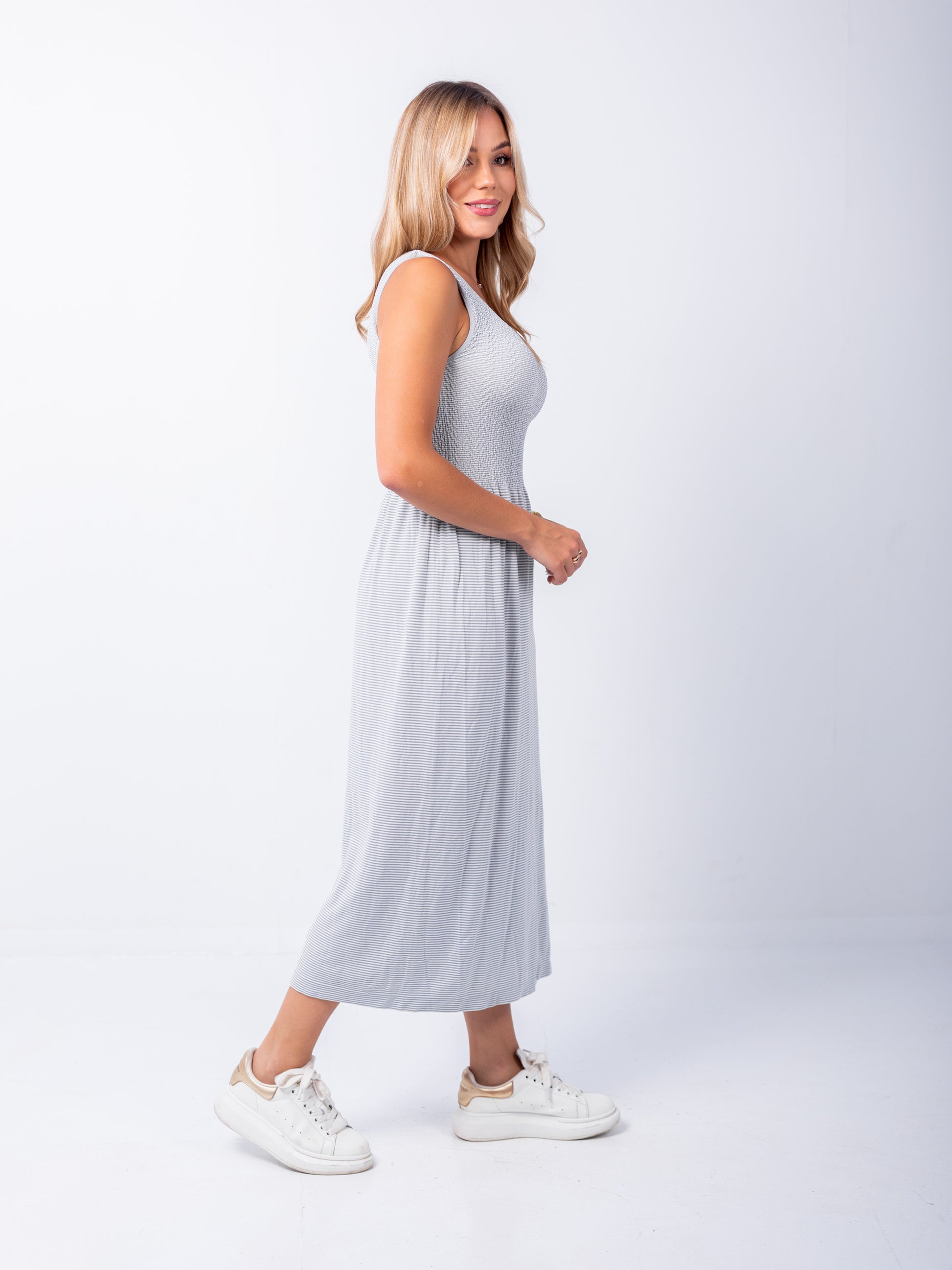 Embrace the casual chic look with our striped maxi dress. Designed with a textured, smocked top and a contrasting horizontally striped skirt, this versatile piece offers a comfortable and fashionable silhouette.